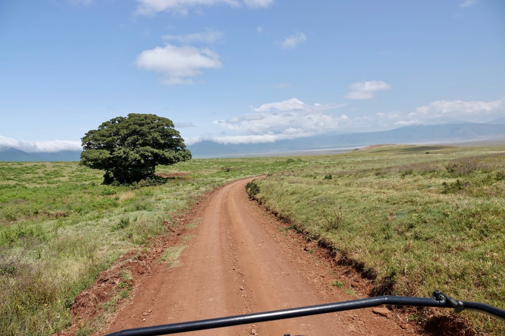 Cape Buffalo herd seen from the lookout on the crater rimAnother view down into the crater from the rim lookoutThe road down into the crater… the clouds sat along the rim of the crater all day, framing the picture in soft white atop the green steep walls