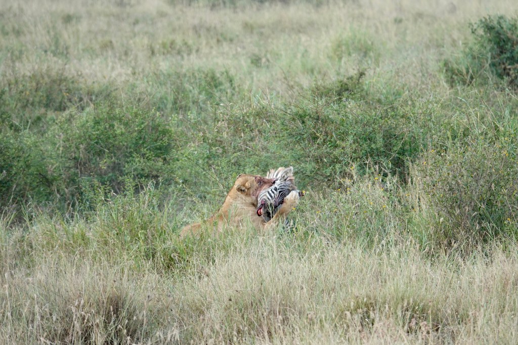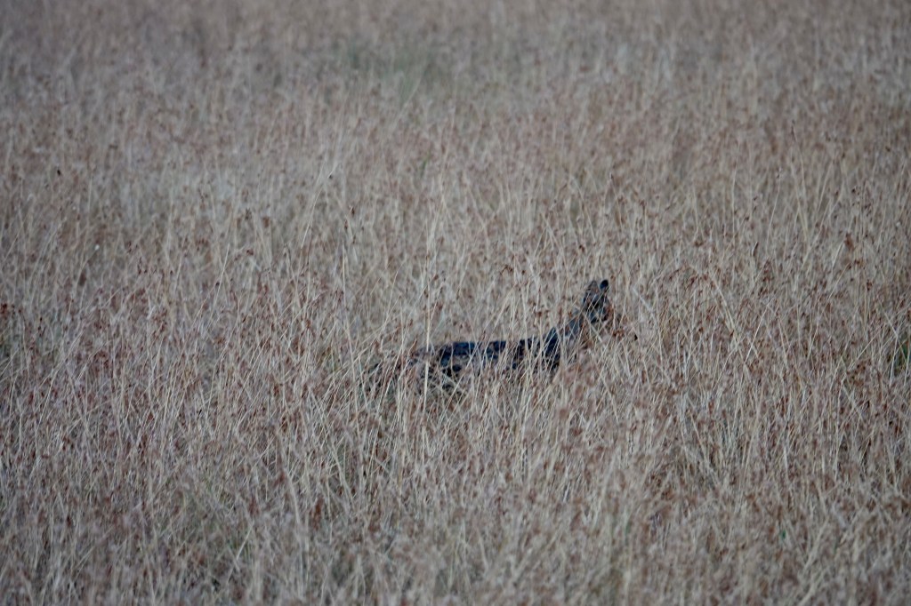 Lioness heading off with a piece of baby zebra Black backed jackal – making use of the grass concealment!The ‘anxious’ hyena The reason why the Hyena was anxious …Lionesses and cubs restingWhat do I see? The wind was blowing towards us and all of a sudden the lionesses were up and looking upwind.One of these Wildebeest is about to have a bad day Off on the stalk of the wildebeest… yes she is wearing a tracking device of some sort. Apparently several of the dominant females are tracked from various pridesCubs watching on with great interest The kill of the wildebeest took place in dead ground to us .. the plume of dust at the top left marks the spot. The sounds were startling.
