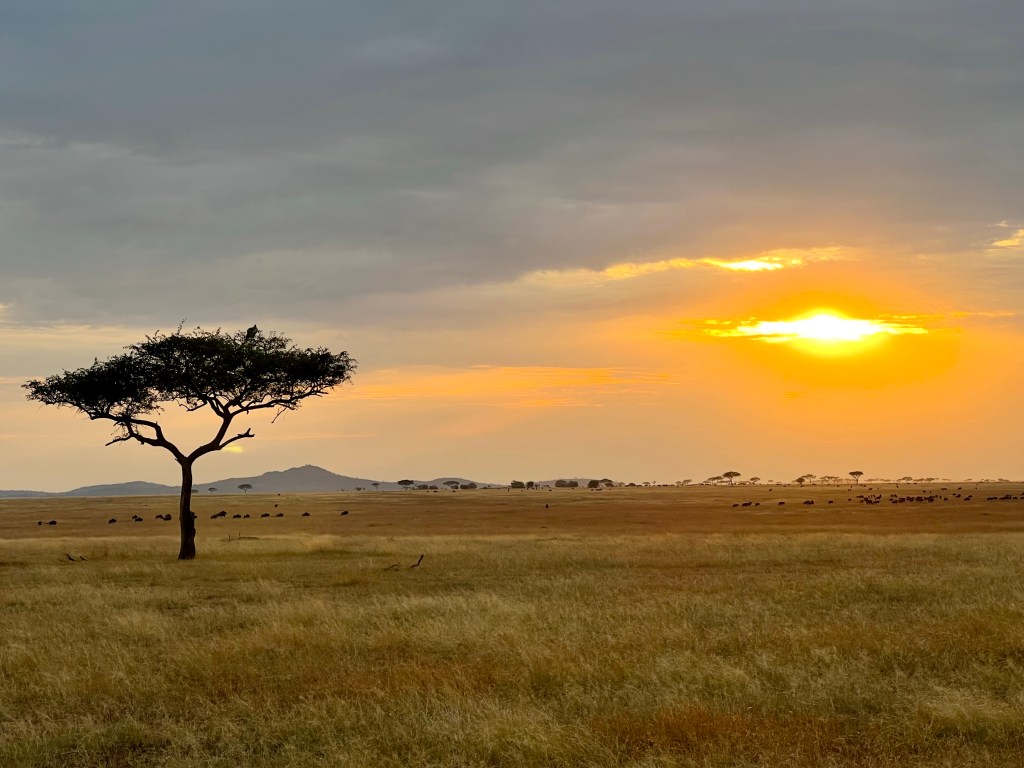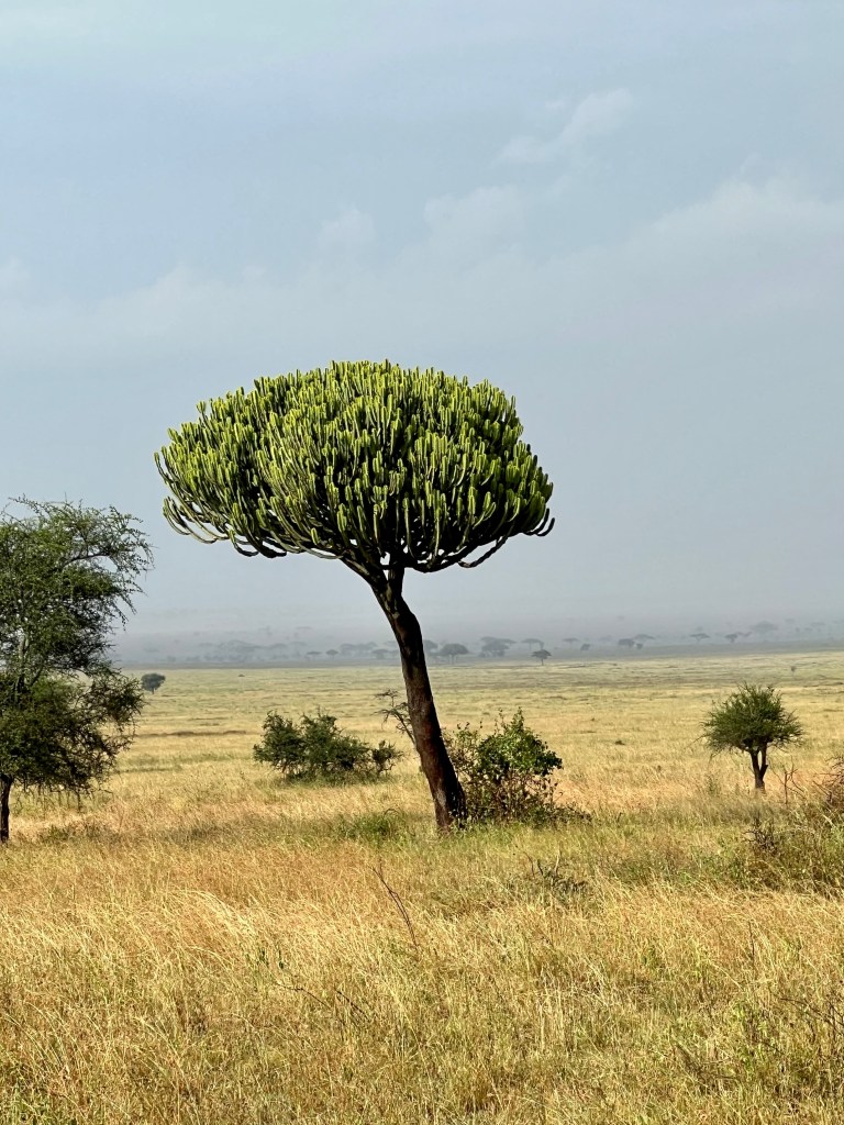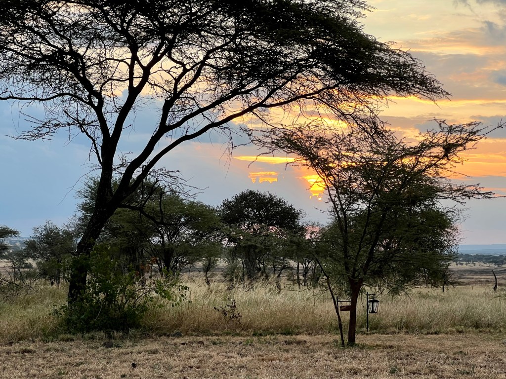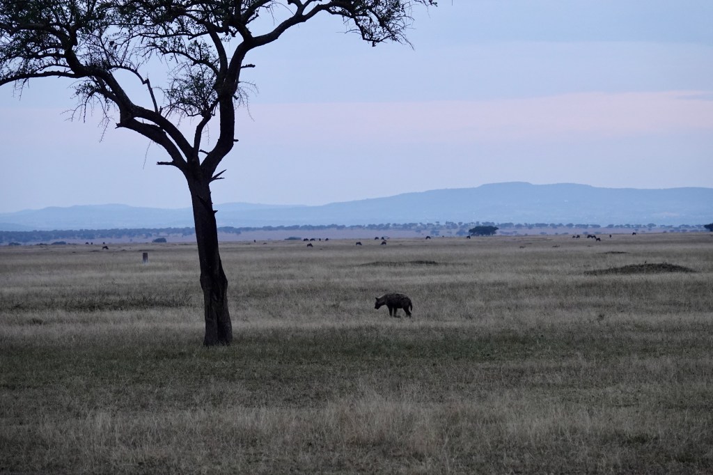 The aptly named ‘candelabra’ treeIf you look closely you can see a few giraffes in thereCountry around our accommodation at Acacia Central CampActually the Ngorongoro Crater…🤫🙄Great sunset shot by Nessie. Note the vulture (Lappard Faced) in the tree!A view from our deck at sunset at the campSunrise over the Savannah on Wednesday morningLone Hyena doing morning wandering