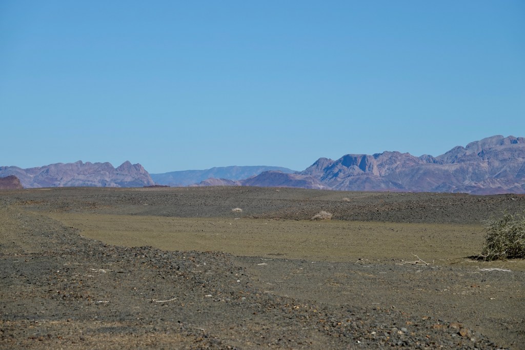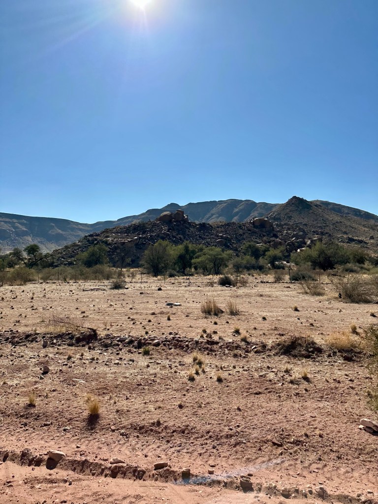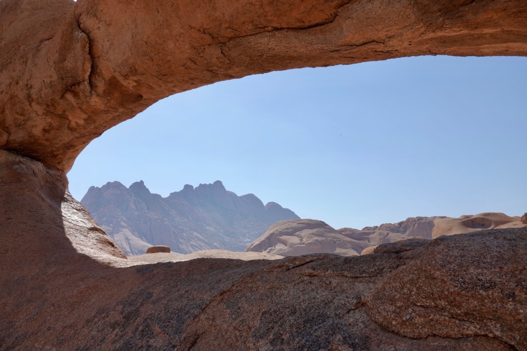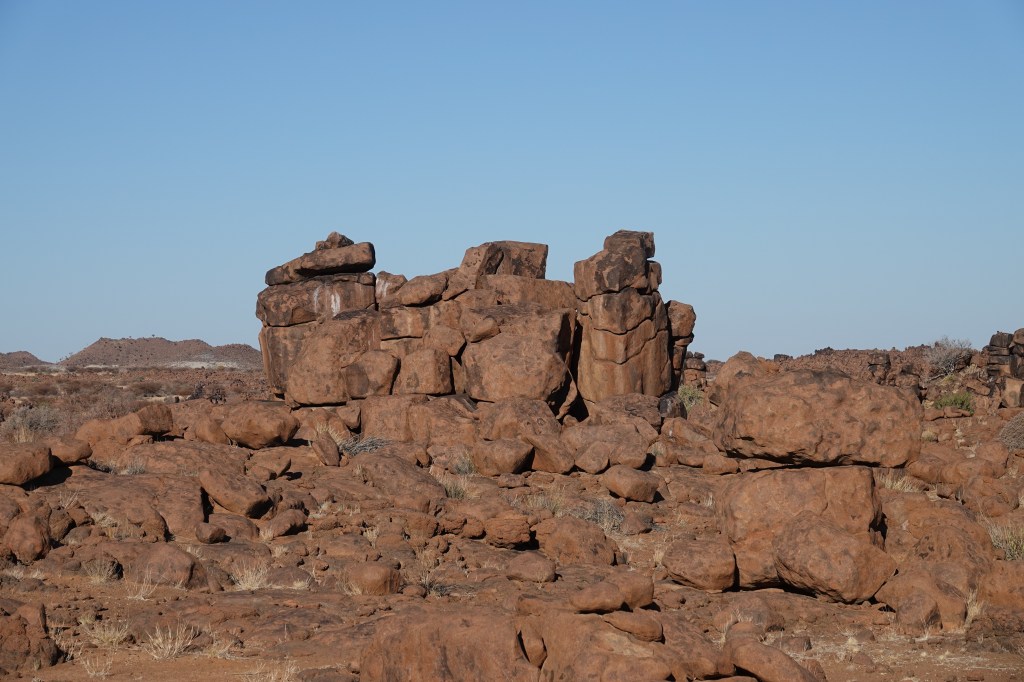 After the paintings we walked around a kilometre and a half though the area to another outcrop with a ‘window’ eroded through it, framing the sky and surrounding area. After photographs it was lunch by the truck and off for a few more hours of shitty corrugated roads. About 90 minutes later we paused for a comfort stop in the tin mining town of Uis. The name ‘Uis’ means ‘dry’ in the local Damara language. The place is aptly named.