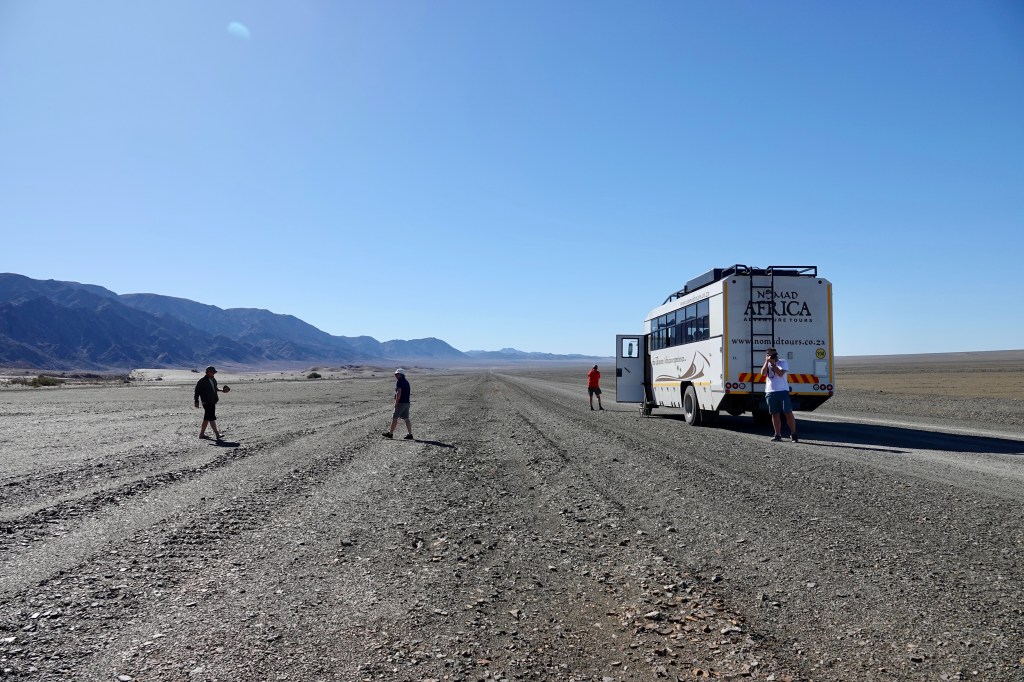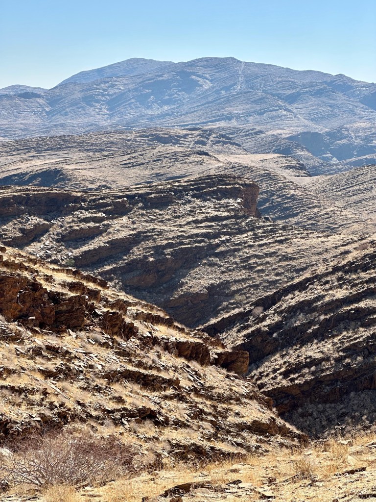 Then it was back onto the dirt roads for our trip down into the Namib Desert proper. On the way we went down through a steep and windy pass, with spectacular hills all around.