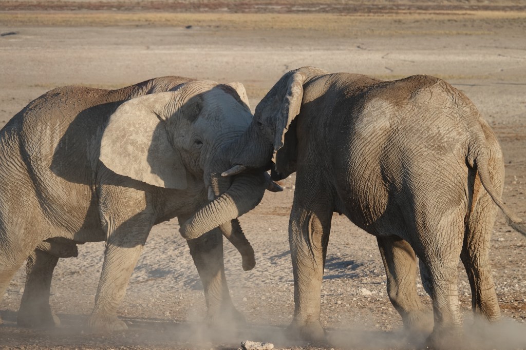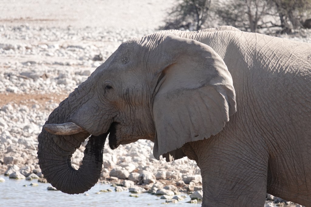 The Etosha Elephants are big. Often up to a metre higher at the shoulder than those routinely found in areas such as the Kruger National Park in South Africa. Another feature is their tusks don’t grow particularly large, nor are they particularly strong. Several reasons apparently account for this. One is mineral deficiency- while these Elephants get a surfeit of calcium from the Etosha environment, they often lack phosphorus. Another factor is the aridity of the area, with another being genetics.