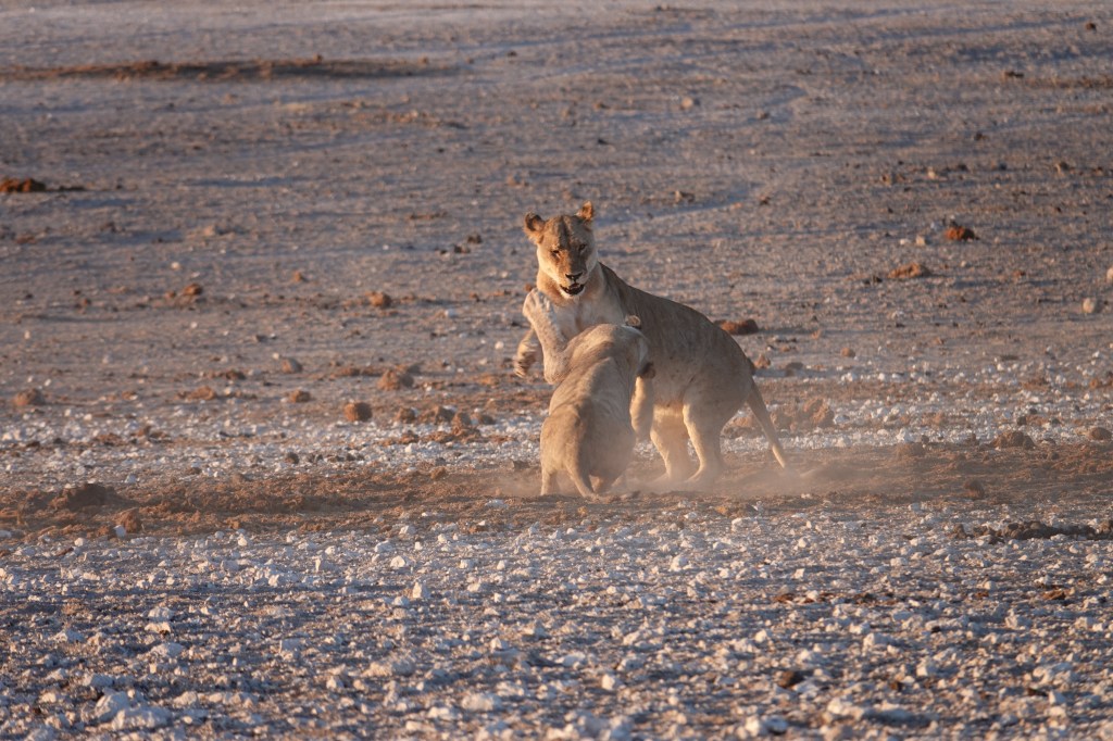 A bull, note the short tusks, common in the Etosha RegionSeven young lion cubs drinking. Yep, 7. The one on the left of shot was mischievous, Mum or one of the Aunts is keeping him under control Sisters play fighting Heading back to the bush after the morning drinkYoung bulls fighting Black Rhino cow and calf