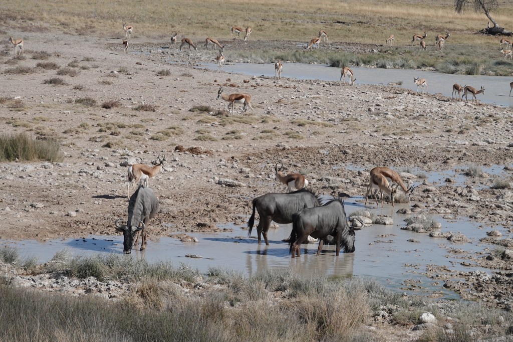 The area has a lot of wildlife, there are two main reasons. The first and obvious one is it is a large Park where they are generally safe from getting snotted by poachers and trigger happy farmers. The second is because the area ( which has a largely limestone substrate) has a lot of springs and artesian water. Where the springs don’t bubble up naturally some waterholes are assisted by being bore fed. The presence of persistent and reliable water is, of course, a major factor in the population size of the grazing animals in semi- desert areas. Similarly, large amounts of herbivores support the predators that rely upon them. So, in short, we saw a lot of game. Monday was a bitterly cold day, a wind blowing from the east was very chilly- apparently it was snowing down in South Africa, including near Citrusdal where we stayed on the first night of this trip.