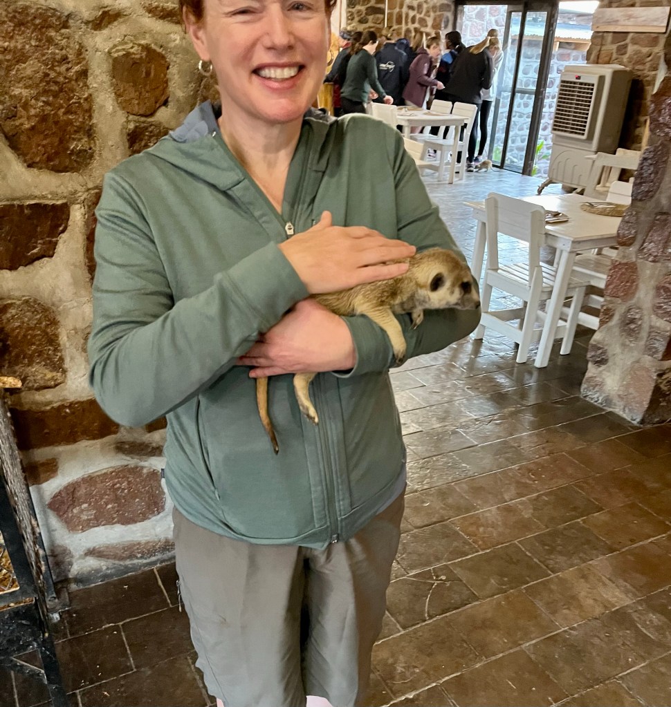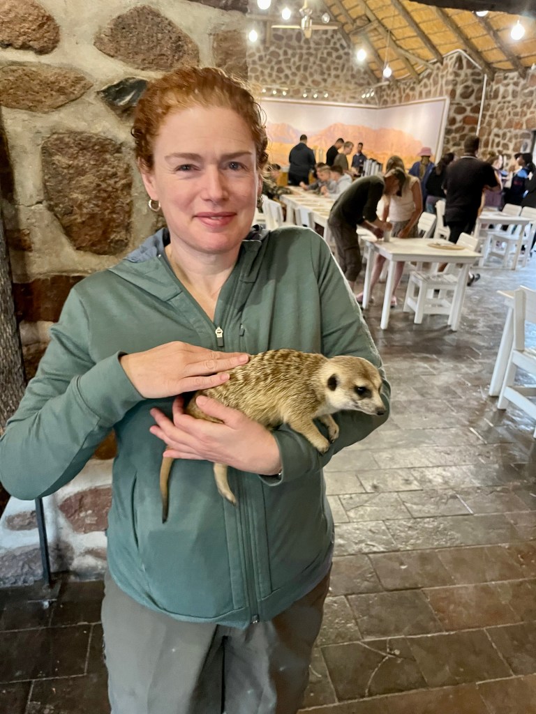 A highlight at Breakfast on Saturday Morning was the presence of the Lodge’s two Meerkats. Ness was all smiles – the only animal she had really, really, really wanted to see in Africa was a Meerkat, so she was very happy. She even got to cuddle one of them!