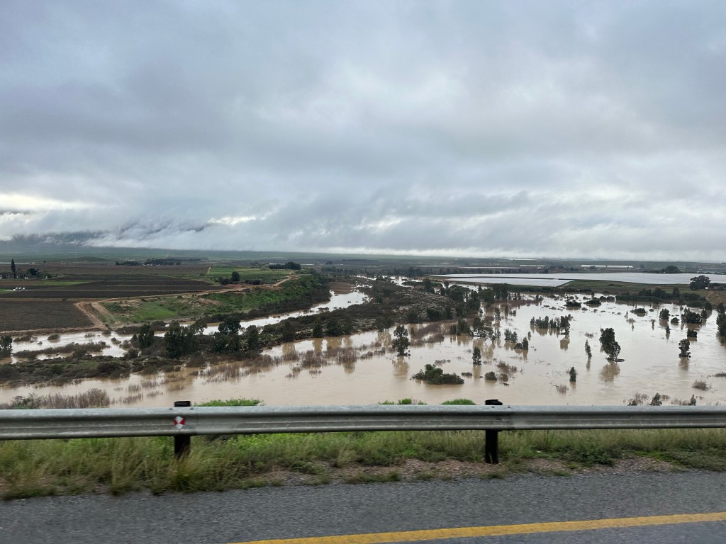 A lot of flooding aroundSky cleared late morning The problem area Lunchtime stop under roadside sugar gunsCrossing the Orange River into Namibia The Orange River is South Africa’s longest river. It rises in Lesotho and flows into the Atlantic Sun setting as we do a big hook back North , then west and south to get to our destination after the big detour .. it was a long day