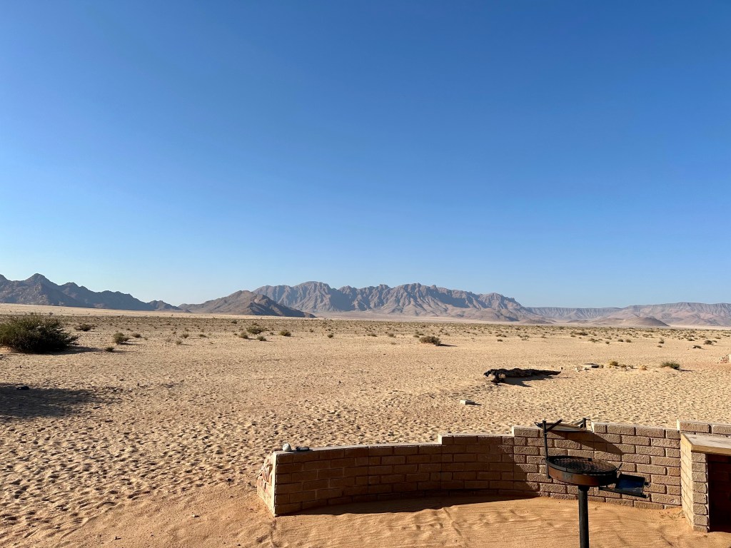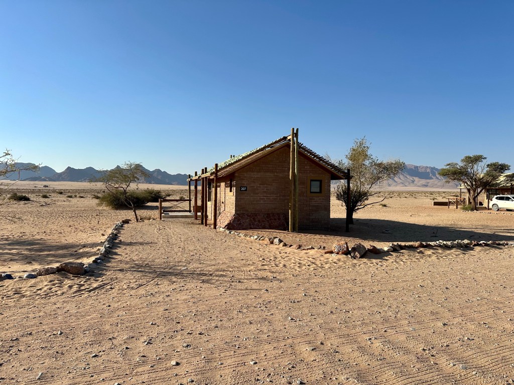 From there it was down a valley with stunning ranges either side- the valley gradually opening up and becoming wider as we went. We went past a game farm where White Rhino were seen. Along the way we saw a lot of Oryx, quite a few very cute Bat Ear Foxes ( which apparently only eat insects/ termites) , Springbok and Mountain Zebra. After about an hour past the pass we did a left hand turn and 15 minutes later we were at our accommodation for the next two nights – Sossusvlei Lodge Desert Camp near Sesriem on the edge of the Namib-Naukluft National Park.