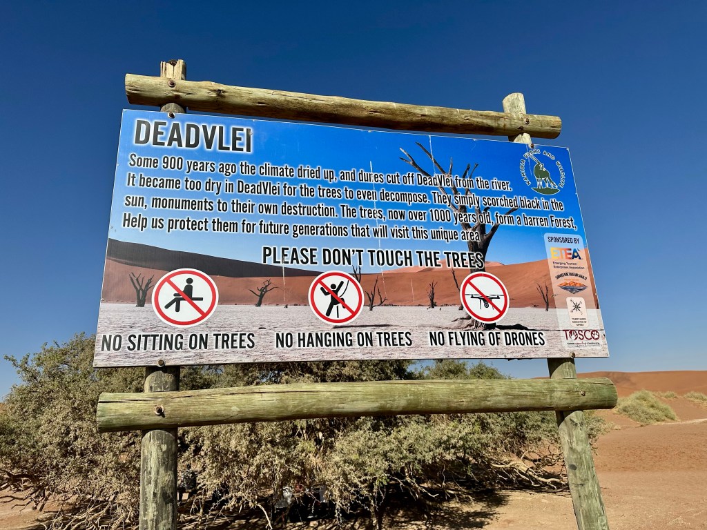 After a walk around the dry Sossusvlei we walked around a kilometre over to the Deadvlei car park. Deadvlei cunningly gets its name from the fact it is a vlei and everything in it is dead. The attached photo explains it, but essentially around 900 to 1,000 years ago the dune fields cut the Deadvlei off from the river feeding Sossusvlei. The trees in the Deadvlei , cut off from water died. They are now preserved, dried out and dead, standing as dark sentinels against the yellow backdrop of the vlei. It was around a 2.5 kilometre return journey up and over loose dune sand in the midday heat.