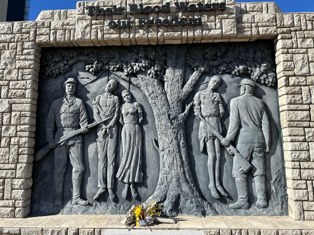 Depiction of the Germans advancing relations with others on the genocide memorial.The genocide memorial showing the people breaking the chains of oppression