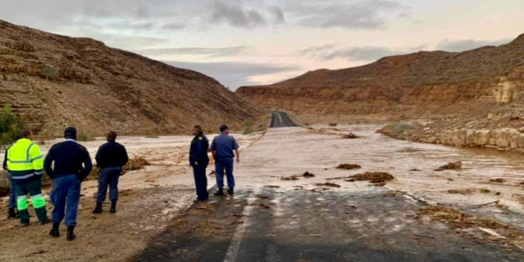 The rain had continued overnight- causing a problem for our journey to Namibia. The road north of the town of Springbok was both underwater and washed away. It was closed. This necessitated a nearly 400 km detour to a border crossing that was accessible. We barely made it before the South African post was closing and didn’t make it to the Namibia post , which was closed when we got there, flag down and all. Thankfully the Namibian border guards were good guys and opened up and let us in. Otherwise we would have been spending the night on the truck, on the bridge over the Orange River, between the two countries.