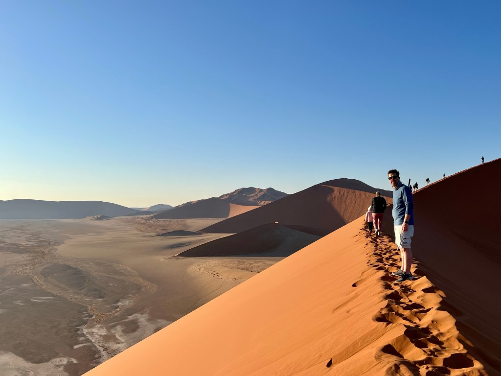 The view from the top over the surrounding dune field was spectacular and worth the effort. The low angle morning sun illuminated the sand in various hues of red, while also casting shadows that clearly delineated and highlighted sharp dune edges and ridge lines.