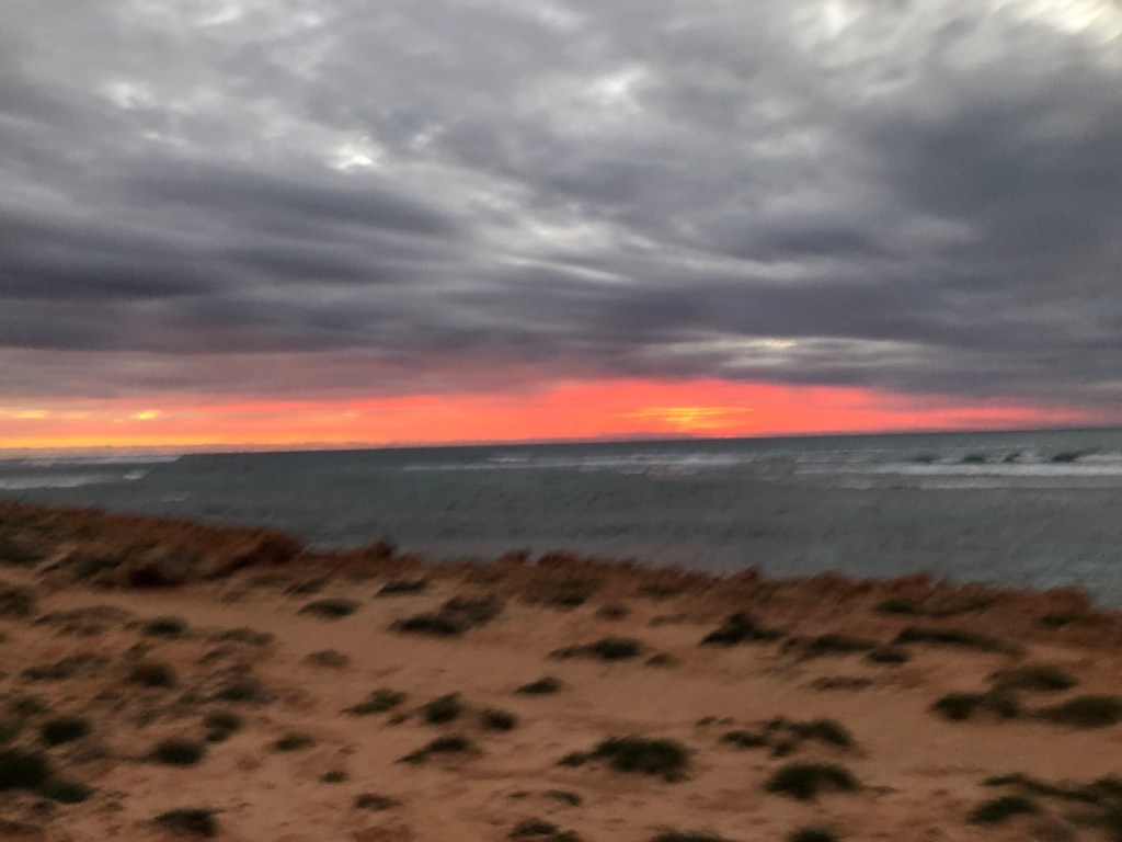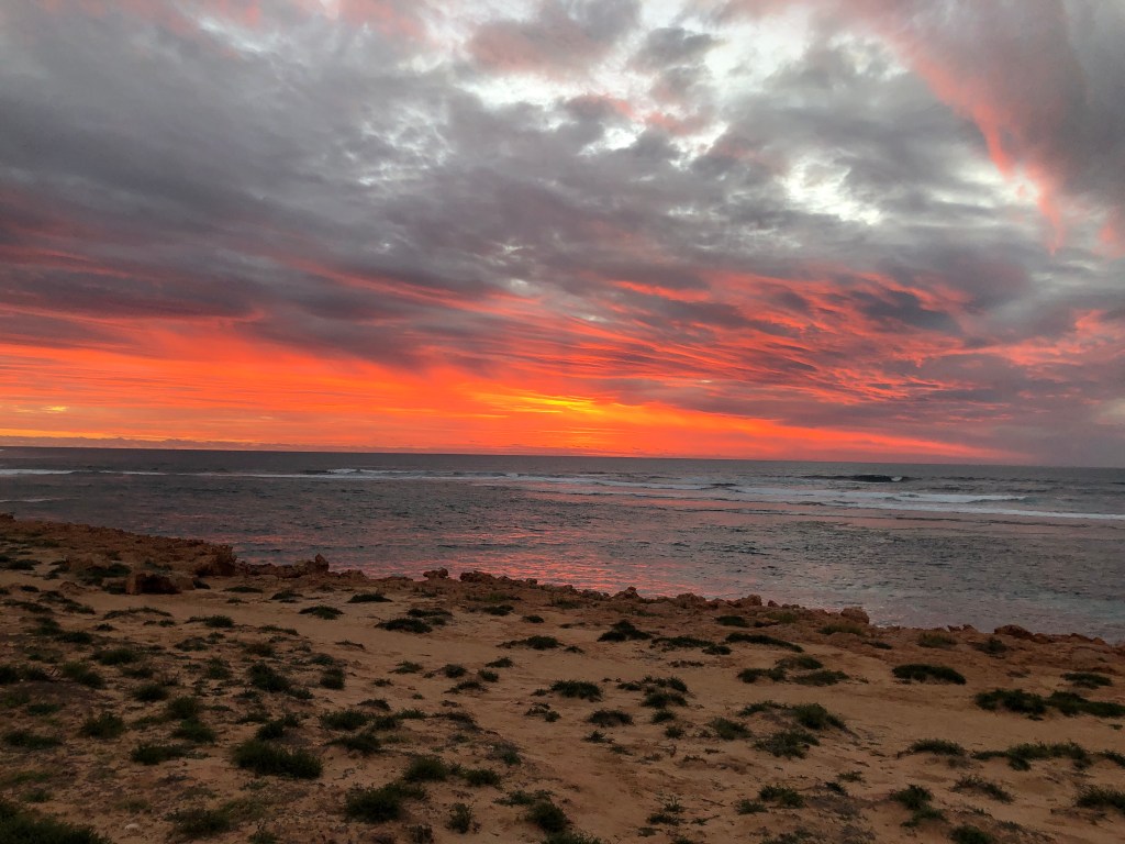 A great campsite , around 100 metres from the beach with awesome views and a stiff breeze to keep the flies down . After setting up it was time for a walk and swim. Sunset that evening was probably the best one yet – that is saying something as WA has really turned it on.