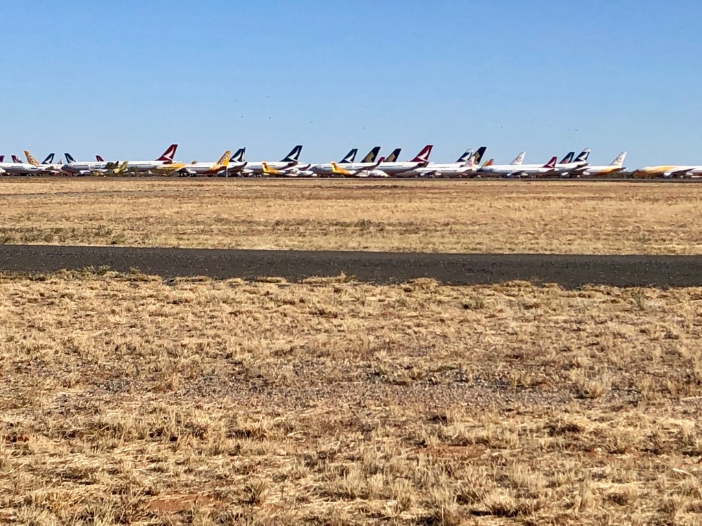 A phenomenon of the pandemic has been a massive reduction in international air travel – leading to the requirement to have somewhere to park the aircraft not in use. The answer for some Asian based carriers has been to mothball aircraft in Australia’s central desert. Which creates the strange sight of seeing more aircraft across from the runway in Alice Spring’s airport than you would normally see taxiing to the gate in Heathrow or Changi. Counted over 5 dozen from the roadside – and pretty sure the actual number is higher than that .