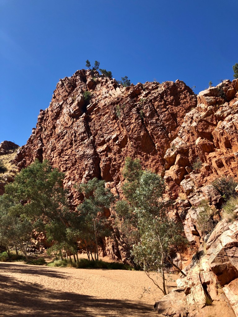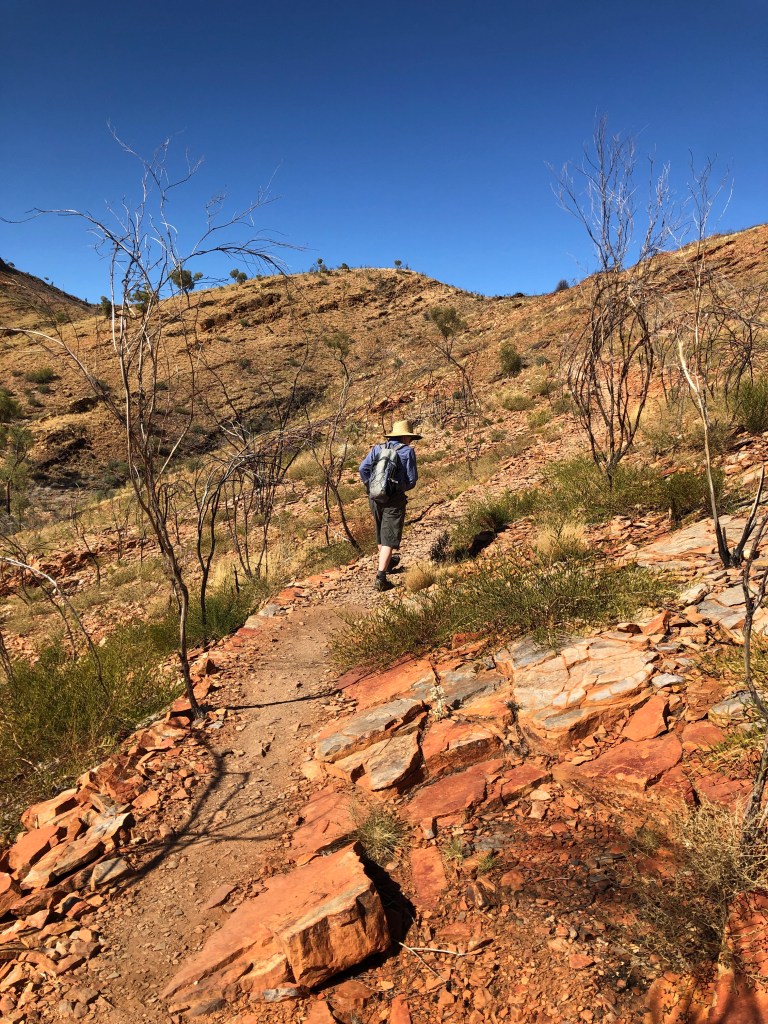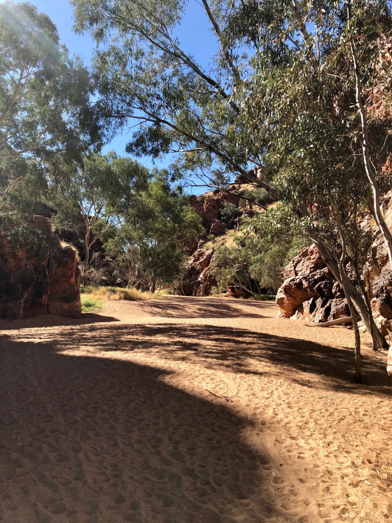 After the walk we had a picnic lunch in the creek bed. As we got back to the car a fella was taking great delight in telling everyone that Alice Springs was going into lockdown at 1 pm … ( it was now 1.30pm) . That piece of info was initially rated ‘F8’ on cred / reliability, but was we drove back to Alice the procession of 4WD with Queensland plates towing vans streaming past us towards the East added credence to the tale.