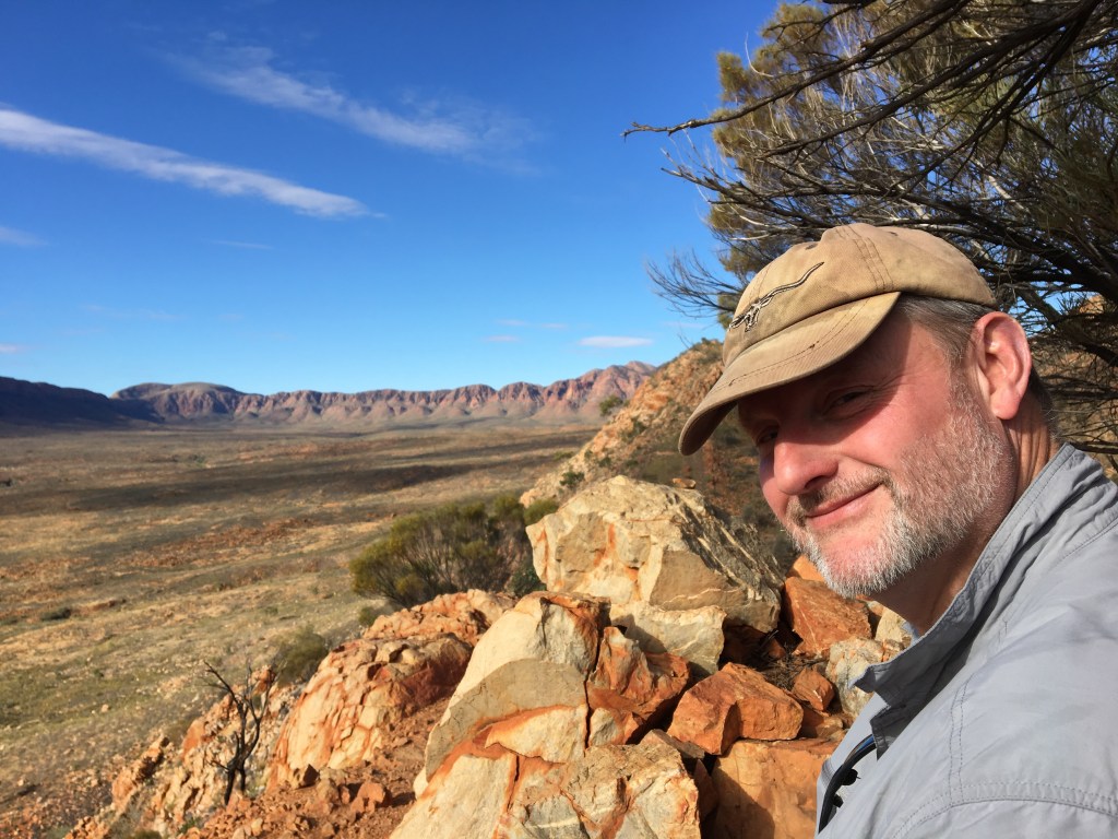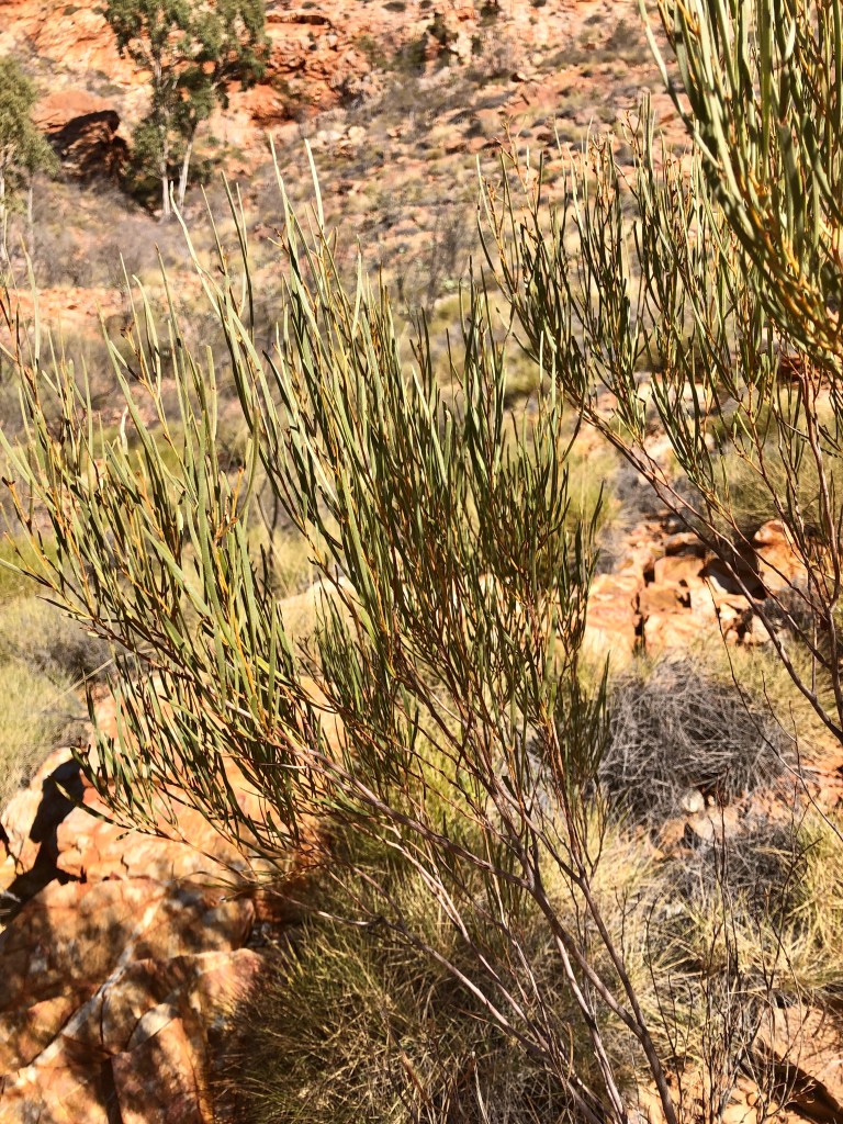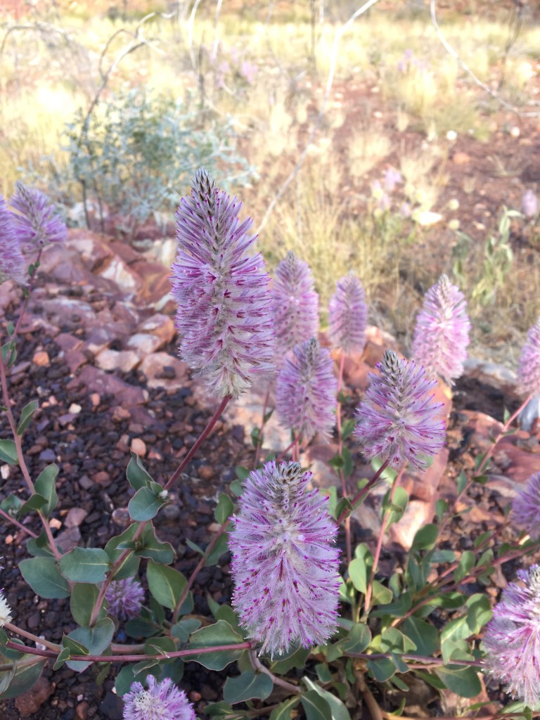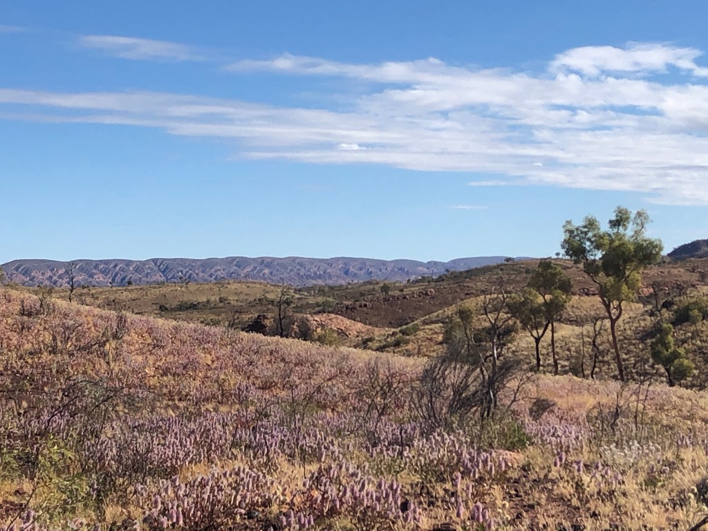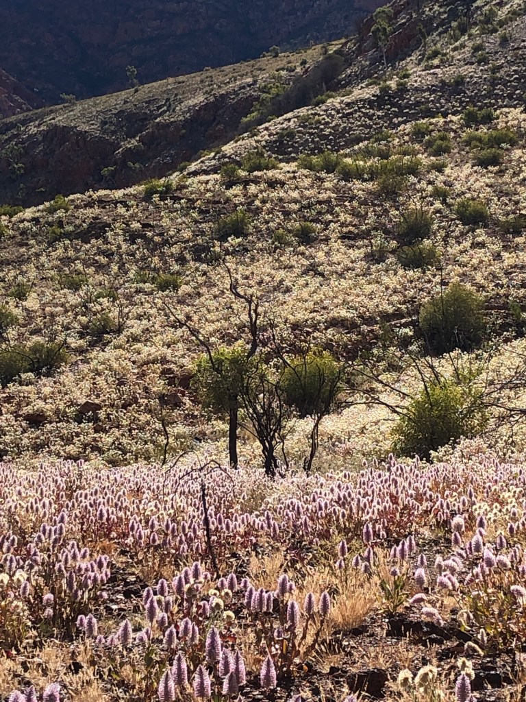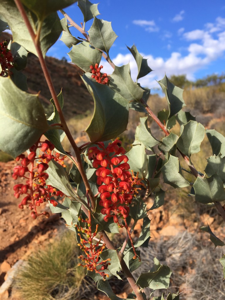 Ness powering up the track at OrmistonView towards Glen Helen ( SW) Mulga! an amazing Acacia…The ‘Budgie Tree’ – Full of nesting budgies in every nook and cranny Holly Grevillea Some of the amazing wildflowers enroute Top of Ormiston Pound lookout Enjoying the Majestical 😉