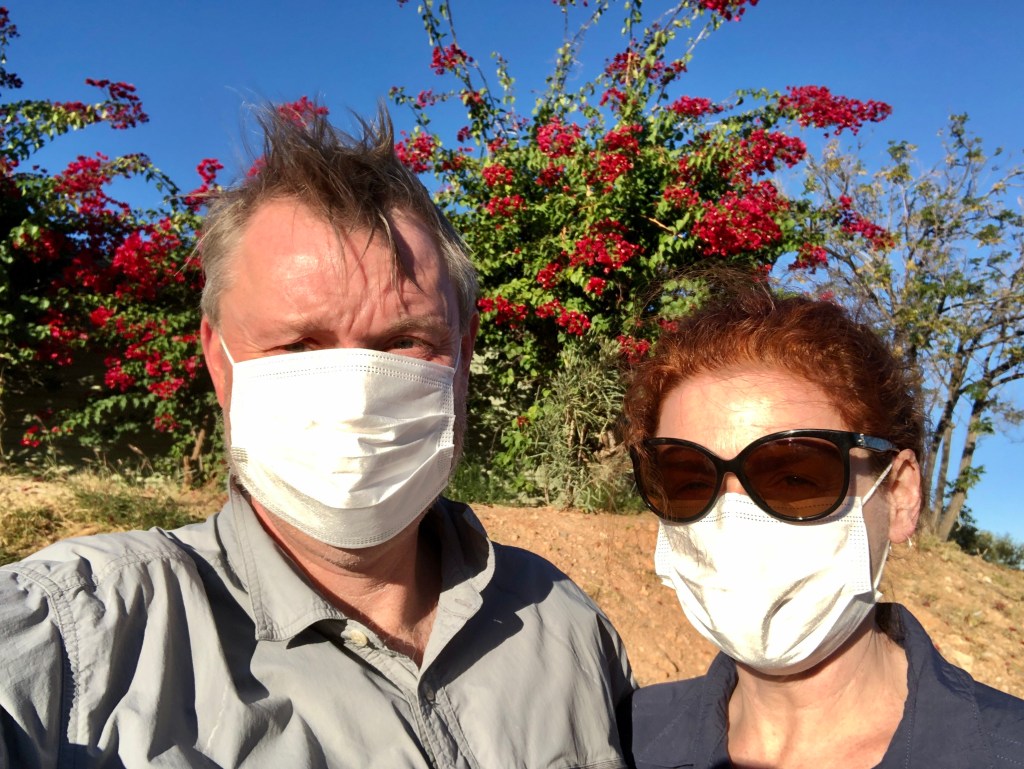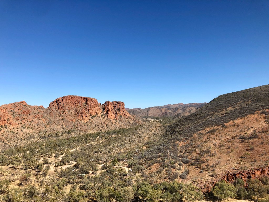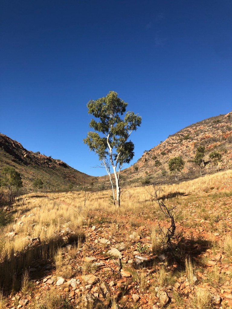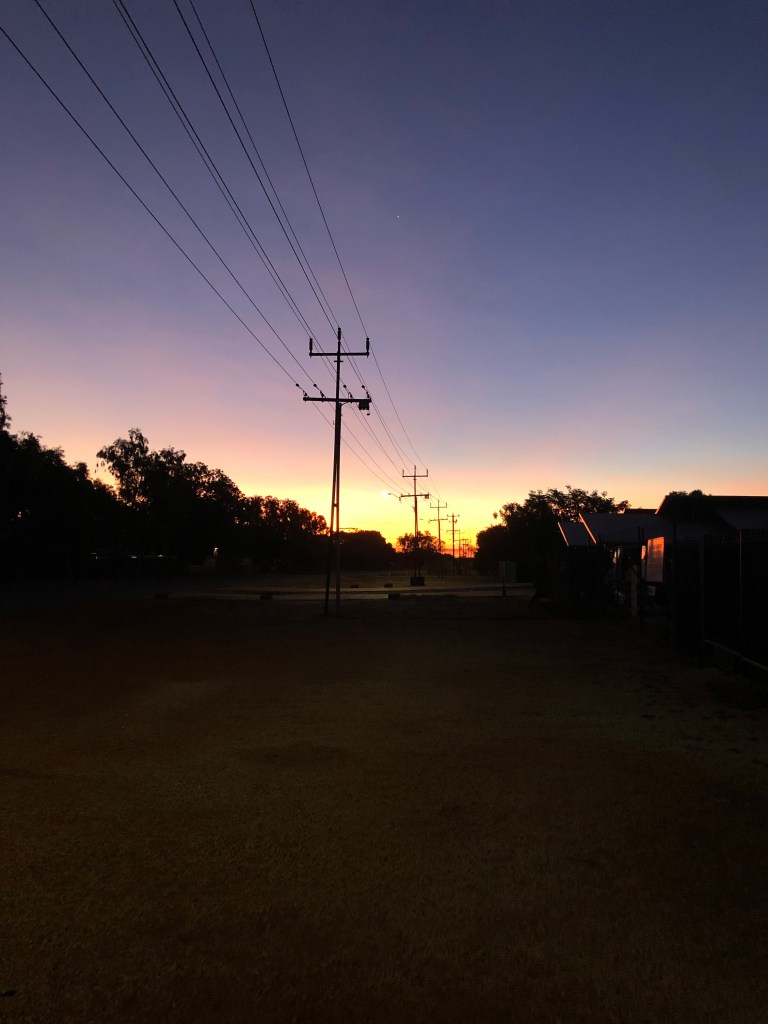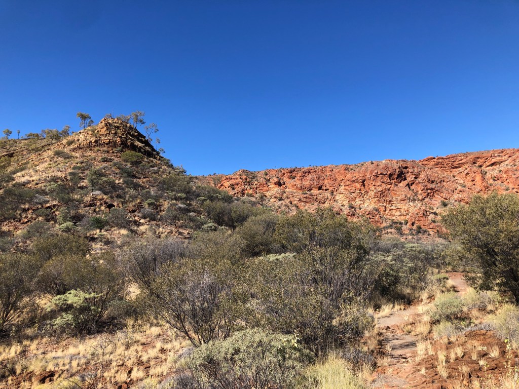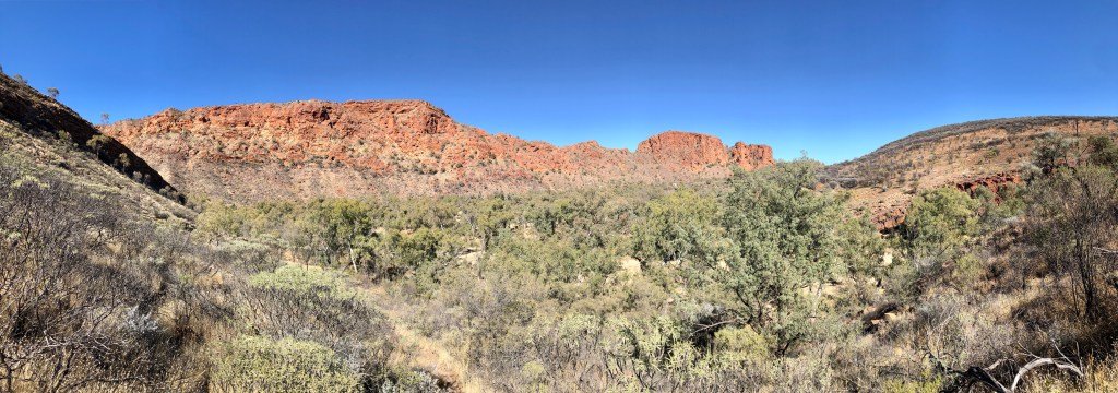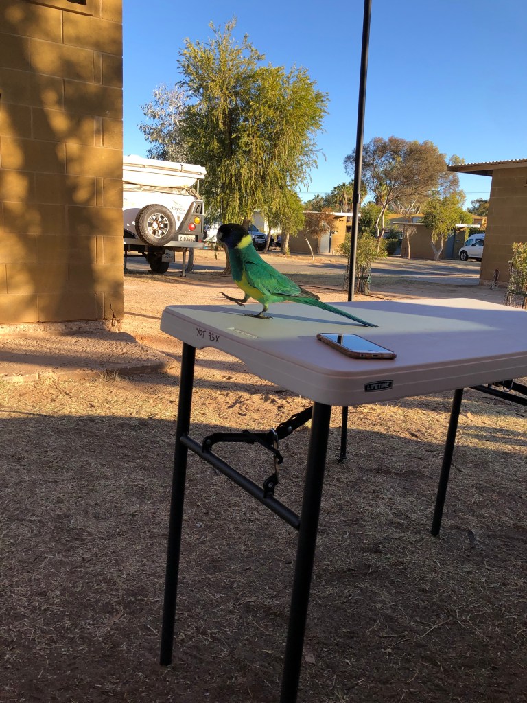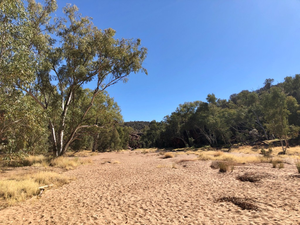 24 hours down, 48 to go. A lovely day weather wise, sunny and not a cloud in the sky. A bit of a (masked) walk in accordance with the restrictions to and along the dry bed of the Todd River through Heavitree Gap. Ness ‘rescued’ a kid who had managed to lock himself in a bathroom at the caravan – lots of banging and calls for help , no adult supervision for in sight , apart from that a lovely sleepy and quiet day.