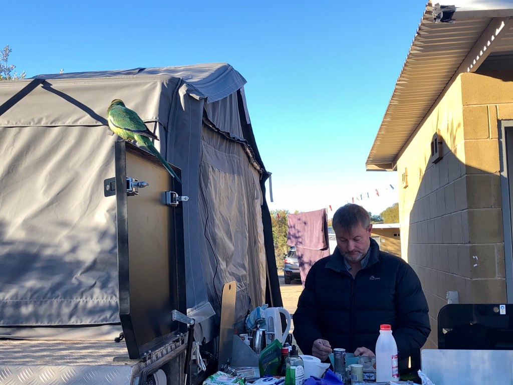 The day started beautifully. Clear, warmest morning yet on the trip… and visitors for breakfast. A family of Ring-necked Parrots dropped in.