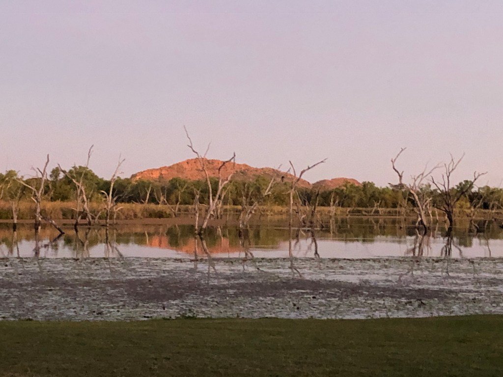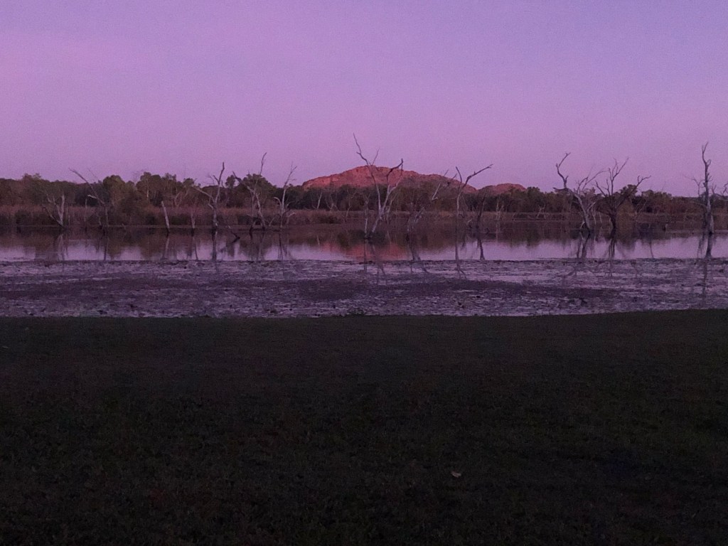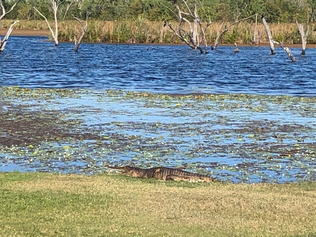 Now in Kununurra. Stunningly beautifully situated campground on the lake . Have introduced ourselves to the local fresh water croc sunning on the grass , and witnessed a beautiful sunset .