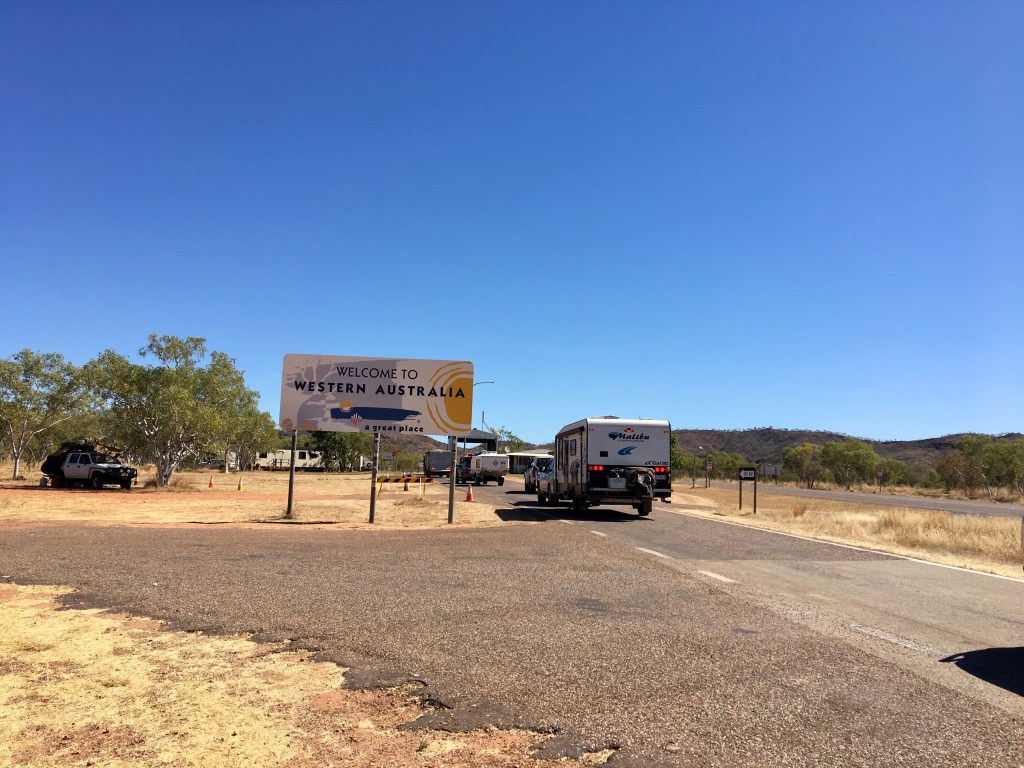Up at 5.40 AM ( fruit bat clamour and middle aged man’s bladder). So some Bogan dust coffee, pack up ( stealthy and quiet so as not to wake up the entire campsite) and on the road early . Fuelled up in Katherine , including a slightly better coffee from the local Scottish restaurant, then heading west on the Victoria Highway. Some more fuel in Timber Creek, then the Border.