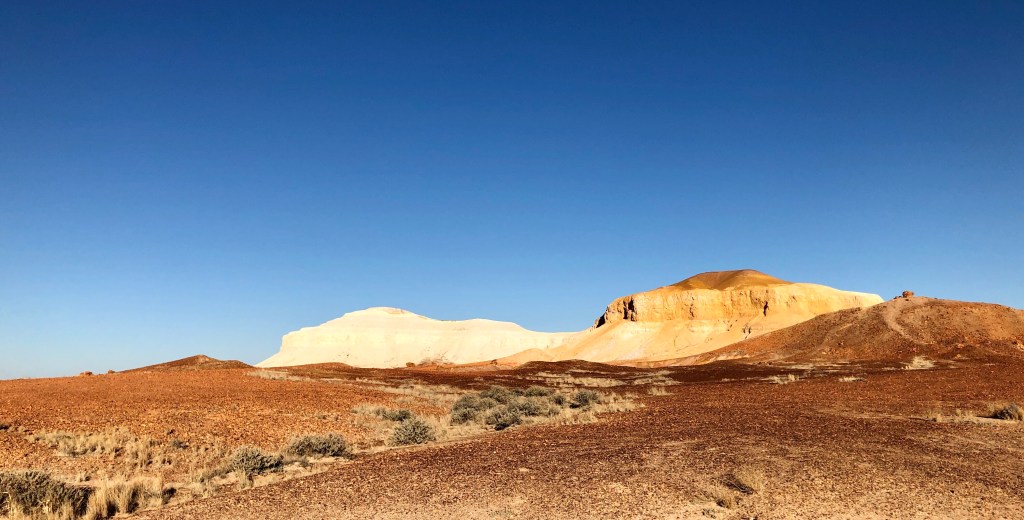 A highlight was our visit to an area North West of town along the Dog Fence. Known as the ‘Breakaways’ when Mark was a kid, the preferred name today is the Kanku-Breakaways. These are stunning geological formations facing off north to Gibber Plains stretching towards Oodnadatta.